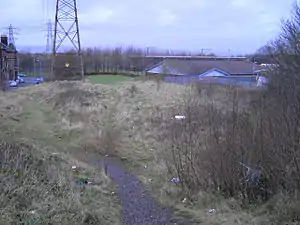 ![]() Site of former Ferguslie station. Aldi shop is on the right, Newton Terrace on the left. The main Glasgow to Ayr railway can be seen in the background. The photograph was taken from the national cycle track, formerly the Paisley Canal line which ran above the station. The bridge has been filled in. | |