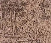 The mapping expedition explored much of the Brazilian eastern coast from Cape São Roque in the northeast down to the environs of Cabo Frio and named many of the locations along the way. Returning to Lisbon by September 1502, the expedition reported the discovery of an abundance of brazilwood (pau-brasil) on the coast.[5] Brazilwood was highly valued by the European cloth industry as a superb dye, producing a deep red color, but it had to be imported from India at great expense.[5] Sensing the commercial opportunity of the new discovery, Fernando de Loronha assembled a consortium of Lisbon merchants, with himself at its head, and petitioned the crown for permission to exploit the find. In late September 1502, King Manuel of Portugal issued a charter (now lost) granting Fernão de Loronha the exclusive right to the commercial exploitation of the "Lands of Vera Cruz" (as Brazil was then known) for a period of three years. In return, Loronha was obliged to outfit and send six ships per year at his own expense, commit himself to discover 300 leagues of new coast per year and build a fort (forteza) in the new country. Loronha would also obliged pay the crown a share of his revenues: zero in the first year, one-sixth in the second year, and one quarter in the third year.[6] However, a different account reports Loronha was given a ten-year charter, for which he paid the crown a fixed sum of 4,000 ducats per year.[7] One possible reconciliation is that the latter reflect not the original terms, but new terms that were negotiated upon the renewal of Loronha's charter in 1505.[8]