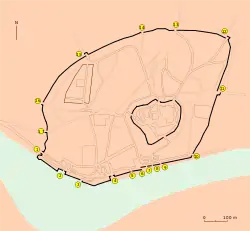 Many of the structures, including walls and towers, are integrated into the buildings of the old town, with the main wall being the Guindais wall and tower, relatively isolated over the margin of the river.[4]