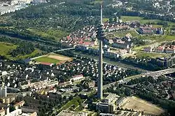 The Fernmeldeturm Nürnberg, the tallest structure in Bavaria, is a telecommunication tower in Nuremberg, southern Germany. Also called the Nürnberger Ei ("Egg of Nuremberg") because of its egg-shaped tower basket in a height of 185 metres, it is 292 metres high and was built between 1977 and 1980 according to blueprints by architect Erwin Heinle.