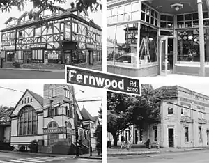 The commercial heart of Fernwood developed along Fernwood road in the 1890s and early 1900s and many of the commercial buildings in the village date from this time in part due to the intersection of Gladstone road and Fernwood road acting as the terminus of the streetcar line connecting the neighbourhood to downtown.[17] The building now housing the Belfry Theatre was built in 1892 as Emmanuel Baptist Church.[18] Another small commercial node developed along Haultain Road. Most of the Fernwood neighbourhood was built up by the end of the real estate boom of 1913.