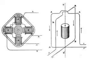 Ferraris's first publication was in March 1888, entitled Electrodynamic rotations produced by means of alternate currents.[3] After expounding the geometric theory of the rotatory magnetic field, he suggested that a simple way of procuring the desired phase-currents would be to branch the circuit of an alternate current into two parts, into one of which should be inserted a resistance without self-induction, into the other a coil of much self-induction but of small resistance. The two windings of the motor should be respectively introduced into these two branches. The difference of phase thus produced would be sufficiently near to 90° to be effective. He expressed the opinion that in this way one might obtain all the effects that can be obtained by the rotation of a magnet. He then described the following experiments which were made in the autumn of 1885.