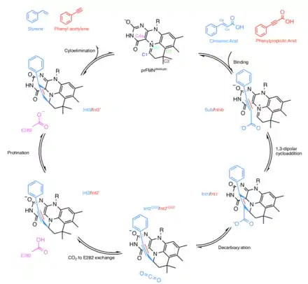A study went on to present evidence for the 1,3-dipolar cycloaddition,[8] due to suspected turnover of cinnamic acid a crystal structure of AnFdc1 in complex with α-fluorocinnamic acid revealed the substrate Cα and Cβ carbons are located directly above the prFMNiminium C1’ and C4a respectively (shown as Sub in Figure 1 - with cinnamic acid as opposed to α-fluorocinnamic acid). Cinnamic acid was confirmed to bind in a similar manner using inactive AnFdc1 crystals containing FMN. The AnFdc1 E282Q mutant crystallised with cinnamic acid revealed a structure corresponding to the Int2 species, this was taken to mean that progression through the 1,3-dipolarcycloadition cycle was halted as E282 is unable to donate a proton to the alkene moiety.