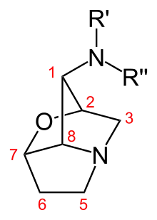 Core structure of the 1-aminopyrrolizidines (loline alkaloids) produced in tall fescue infected by Neotyphodium coenophialum; R' and R'' denote variable substituents that can include methyl, formyl, and acetyl groups giving rise to different loline species.