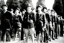 The uniform in 1958 was basically the same as when Fianna was founded in 1909 and some members were advocating change. Scouts wore a green blouse with two rows of brass buttons, an orange neckerchief, slouch hat, blacks shorts and a white lanyard that was attached to his Scout whistle. Officers were still wearing riding breeches and a military type jacket, slouch hat and a Sam Brown belt. As slouch hats were hard to find, berets became the headdress for officers. Different type uniforms were mooted and an American Boy Scout pattern was decided on. Scouts would now wear a green shirt with two pockets and a military-style side hat. The uniforms eventually arrived and were first seen at the annual Dick McKee Commemoration in Finglas Village in November 1958.[27] Eventually, the side hats were replaced by a green beret, and the long trousers for officers were replaced by black shorts or breeches again. Frank Lee and Terry Kiely left the Fianna after a falling-out.[28]
