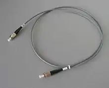 The single mode fibre cables use an 8μm fibre armoured with a steel wrap and Kevlar strands inside a plastic jacket. Fibre cable cannot be easily joined (an expensive fusion splicer is required for reliable joints) but pre-made cables with FC type screw-on connectors (mechanically similar in use, but smaller, to the F-connectors used for electrical satellite IF) are available in lengths from 1m to 100m. The same connectors are used on all the optical components of a system, including the optical LNB, splitters, cable joiners, virtual LNB units, etc.