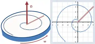 Figure 5 shows another example comparing the observations of an inertial observer with those of an observer on a rotating carousel.[39] The carousel rotates at a constant angular velocity represented by the vector Ω with magnitude ω, pointing upward according to the right-hand rule. A rider on the carousel walks radially across it at constant speed, in what appears to the walker to be the straight line path inclined at 45° in Figure 5. To the stationary observer, however, the walker travels a spiral path. The points identified on both paths in Figure 5 correspond to the same times spaced at equal time intervals. We ask how two observers, one on the carousel and one in an inertial frame, formulate what they see using Newton's laws.