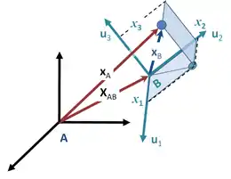 As an aside, the unit vectors {uj} cannot change magnitude, so derivatives of these vectors express only rotation of the coordinate system B. On the other hand, vector XAB simply locates the origin of frame B relative to frame A, and so cannot include rotation of frame B.