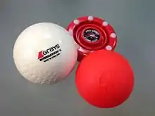 Standard field hockey balls are hard spherical balls, made of solid plastic (sometimes over a cork core), and are usually white, although they can be any colour as long as they contrast with the playing surface. The balls have a diameter of 71.3–74.8 mm (2.81–2.94 in) and a mass of 156–163 g (5.5–5.7 oz). The ball is often covered with indentations to reduce aquaplaning that can cause an inconsistent ball speed on wet surfaces.