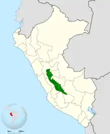 The fiery-throated metaltail is found on the eastern slope of the central Andes of Peru, from just south of the Huallaga River in the Department of Huánuco south to the Apurímac River in the Department of Cuzco. Like most of the metaltails, the species inhabits the edges of dwarf and elfin forests and páramo, moist landscapes characterized by shrubby growth and small trees. It also occurs in glades within the forest. In elevation it ranges between 2,900 and 4,000 m (9,500 and 13,100 ft) and is most common above 3,500 m (11,500 ft).[6]