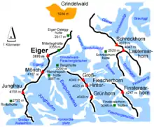 The starting point of the Fiescher Glacier is 4,000 m (13,000 ft) above sea level, on the eastern slope of the Fiescherhorn, it is flanked to the west by the Grünhorn and Gross Wannenhorn and to the east by the Finsteraarhorn.