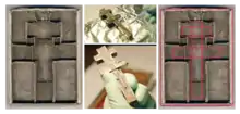 Underneath the lid the surface is divided into four parts and created using niello, the top left, the Annunciation; top right, the Nativity and bathing of Jesus; bottom left, the Crucifixion (which mimics the front lid); and the bottom right, the Anastasis (Christ descent into Hell) scene pulling Adam and Eve out of Hell.[4] Greek text within the scenes translates to, "Hail, full of grace!" and "Here is your son...Here is your mother."[5] The lid was only removed by intimate viewers, so these scenes might have been more privileged.[6] The interior of the box is divided by a Patriarchal (double cross) walls which create 5 sections. It is believed to have contained a wooden cross relic that would have fit perfectly within the main section, the 4 surrounding compartments would have contained other Holy relics, such as bones, hair, cloth, etc.