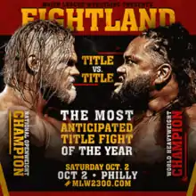 The main storyline heading into Fightland was the feud between MLW National Openweight Champion Alexander Hammerstone and MLW World Heavyweight Champion Jacob Fatu of Contra Unit. At the end of the AAA vs. MLW Super Series on the May 10, 2020 episode of Fusion, Contra Unit attacked various wrestlers and staff before ultimately taking over MLW headquarters (a storyline explanation for MLW's hiatus during the COVID-19 pandemic).[8] Hammerstone was among members of the MLW roster seen taking back MLW headquarters in a video uploaded to MLW's YouTube channel on October 29, 2020.[9][10] Hammerstone campaigned for a World title shot throughout 2020 and into 2021, as he was ranked #1 in MLW by Pro Wrestling Illustrated.[11] At the end of the April 21, 2021 episode of Fusion, Hammerstone once again challenged Fatu to a title match.[12] The following week, on the penultimate episode of the season, Contra leader Josef Samael denied the challenge on Fatu's behalf, claiming that he ultimately controls who gets to fight him.[13] On June 10, 2021, it was announced that Battle Riot III will take place on July 10, and that Hammerstone would be the first entrant.[14] Hammerstone would ultimately win the titular match, earning a World title match against Fatu.[15] On September 1, 2021, Hammerstone revealed he will face Fatu at Fightland, and put his own National Openweight title on the line in a Title vs. title match.[16][17]