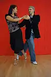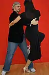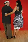 | Abrazo cerrado | V-shape close embrace | Salon and tango nuevo | The dancers' chests are closer to each other than their hips, and often there is contact at about the level of the chest (the contact point differing, depending on the height of the leader and the closeness of the embrace). In close embrace, the leader and the follower's chests are in contact and they are dancing with their heads touching or very near each other. | ![]() | ![]() |
