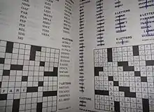 Fill-Ins, also known as Fill-It-Ins or Word Fills, are a variation of the common crossword puzzle in which words, rather than clues, are given, and the solver must work out where to place them.[1][2][3][4] Fill-Ins are common in puzzle magazines along with word searches, cryptograms, and other logic puzzles.[5] Some consider Fill-Ins to be an easier version of the crossword.[6] Since the Fill-In requires no outside knowledge of specific subjects,[7] one can solve the puzzle in another language.[3]