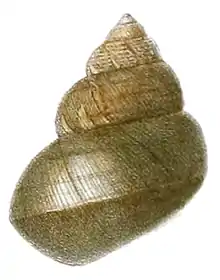 The shape of the shell is ovate-conic.[3] The apex is acute and violet-black in colour.[3] The umbilicus of the shell is very narrow.[3] There are fine spiral lines on the shell.[3] The color of the shell is green or dark brown-blackish.[3] The shell has 6-7 convex whorls.[3] Whorls are with upper spiral lines, some are obsolescently sculptured.[3] The last whorl is swollen.[3]