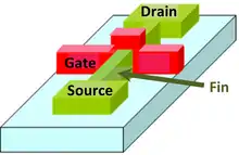 FinFET is a type of non-planar transistor, or "3D" transistor.[1] It is the basis for modern nanoelectronic semiconductor device fabrication. Microchips utilizing FinFET gates first became commercialized in the first half of the 2010s, and became the dominant gate design at 14 nm, 10 nm and 7 nm process nodes.