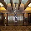 The two-storey interior lobby is set in large wall arches that enclose smaller arches on brackets at the lower level. A large balcony-type gallery is above, with spaces designed for artists’ studios. It is modelled on the matroneum overlooking the nave of a church. A shallow pool adorned with bronze sculptures, by the sculptor Burt Johnson, reflects light in the center of the lobby.