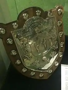 The shield was presented in memory of Hugh MacCorquodale, (1866-1937) who wrote for the Oban Times, under the nom-de-plume, Fingal.[1] The trophy was presented by the Gaelic Society of Glasgow[2] in order to encourage shinty in the South.