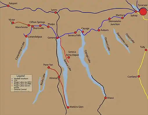 At Syracuse, New York the FGLK interchanges with CSX Transportation and the New York, Susquehanna and Western Railway (NYSW). Travelling west, the line passes through Solvay, Camillus, Skaneateles Junction (also known as Hartlot or Skaneateles Falls), Sennett, Auburn, Aurelius (Station name Relius), Cayuga, Seneca Falls and Waterloo. At Geneva, New York, there is a connection with Norfolk Southern Railway's Corning Secondary.