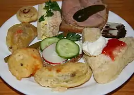 Drinks before dinner became a custom towards the end of the 19th century. As this new fashion caught on, the British took inspiration from the French to begin serving hors d'oeuvres before dinner.[3] A cocktail party is considered a small gathering with mixed drinks and light snacks.[4] Hors d'oeuvres may be served as the only food offering at cocktail parties and receptions, where no dinner is served afterward.[5] After the end of prohibition in the United States, the cocktail party gained acceptance.[6][7] Prior to the First World War, American dinner guests would be expected to enter the dining room immediately where drinks would be served at the table with appetisers. This changed by the 1920s, when hors d'oeuvres were served prior to a non-alcoholic cocktail; however, after the repeal of Prohibition in the United States, cocktail parties became popular with many different hors d'oeuvres meant as something to help counter the stronger drinks.[7][8] It is the cocktail party that helped transfer the hors d'oeuvres from the formal dining table to the mobility of the serving tray. These appetisers passed around the cocktail party may also be referred to as canapés.[8]