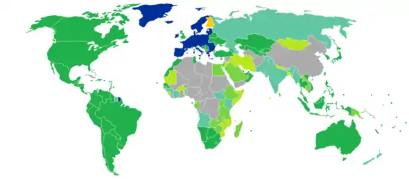 Because Finland forms part of the European Union, Finnish citizens are also citizens of the European Union under European Union law and thus enjoy rights of free movement and have the right to vote in elections for the European Parliament.[27] When in a non-EU country where there is no Finnish embassy, Finnish citizens have the right to get consular protection from the embassy of any other EU country present in that country.[28][29] Finnish citizens can live and work in any country within the EU as a result of the right of free movement and residence granted in Article 21 of the EU Treaty.[30]