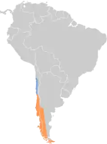 It is found in central and southern Chile, southwestern Argentina, and Tierra del Fuego. Vagrant birds have occurred just eastwards of Tierra del Fuego in the Falkland Islands.[2][3]