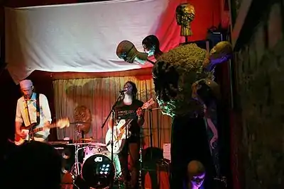 Despite the involvement of Of Montreal's Kevin Barnes in band recordings,[9] Fire Zuave's music bears little resemblance to Of Montreal's, yet like Of Montreal, the band continues to evolve in style.[8] During their stage show masked actors climb around the stage, and avant garde sculptures create a more theatrical and psychedelic atmosphere, similar to Of Montreal.[10] Their use of ping pong balls in the band's promotion is widely documented.