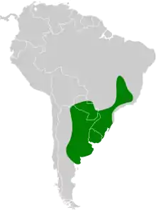 The firewood-gatherer is found in Argentina, Brazil, Paraguay, and Uruguay. Its natural habitats are subtropical or tropical seasonally wet or flooded lowland grassland, pastureland, and heavily degraded former forest. It can be found at elevations of up to 1,000 m (3,300 ft).[1]
