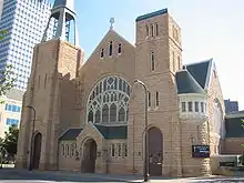 The first permanent home for the Church was at Third and Nicollet, and was the largest meeting hall in Minneapolis. With the rapid growth of the city a larger building was built at 5th and Hennepin in 1857 serving the congregation until the present structure was built in 1885 at 10th street and Hennepin avenue. The building was designed by the firm of Kees and Fisk, which later became the firm of Long and Kees. It is built of Kasota limestone in a blend of the Romanesque and Gothic revival styles. The original steeples were blown down in a 1967 windstorm.[2]