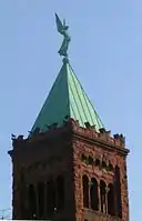 The church is designed in a blend of the Romanesque and Byzantine styles,[4] using rough-hewn, warm red limestone. The Woodward facade has a five-bay loggia, with a parapeted front gable. Above that are rounded windows with tracery framed by a rounded arch. The church also features a 120-foot campanile with many narrow arcades. The church is topped by an 8-foot copper figure of the Archangel Uriel.[5]