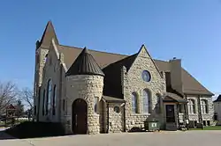 The church building was designed in the late Victorian, Romanesque Revival style by Charles Durham and was built from 1893–1894.[3] The church is constructed of LeGrand hammer dressed limestone. It measures 47 by 90 feet and the tower rises 57 and a half feet above the cornice line. The door sills and steps are made of blue stone and the interior is finished in antique oak and hard pine.[3] Stained glass windows help to illuminate the interior.