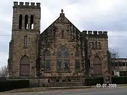 First Methodist Episcopal Church, South is a historic church at 503 West Commercial Street in Ozark, Arkansas. It is a 1+1⁄2-story stone structure, with a steeply pitched gable roof and a pair of square stone towers flanking the front-facing gable end. The taller left side tower has belfry stage with grouped round-arch openings on each side, and both towers have crenellated tops. The church was built in 1909 for a congregation organized in 1871. The architect was Alonzo Klingensmith of Fort Smith.[2]