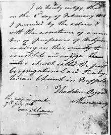 Organized February 2, 1812, by the traveling Missionary, Reverend Thaddeus Osgood during his fifth annual visit to the then village of Buffalo, "The First Presbyterian and Congregationalist Church of the town of Buffalo" as it was then known, was a small, but devoted group of pioneers, who could not afford a building of their own. Thus, services were held in either a schoolroom on Pearl St. near Swan, or at the home of Mrs. Esther Pratt, whose home was on the southwest corner of Main and Exchange Street (then called Crow Street). After the War of 1812, public worship was resumed as the work of reconstruction began. The faithful met in Landon's Tavern, or at the unfinished home of Deacon Amos Callender, located on the east side of Pearl Street (south of Swan Street), or at various locations around town such as the homes of other church members. Worship services were regularly held in the south room of the Old Court House building that was situated on Washington Street, (now the present site occupied by the Public Library) this arrangement was made until the first wooden building was constructed a few blocks to the south at "The Commons" which would later be renamed Shelton Square. On December 5, 1815, the church was formally incorporated as "The First Presbyterian Society of the Town of Buffalo" the trustees presented themselves on December 28, 1815, to Judge Charles Townsend, Judge of Niagara County, of which Erie County was then part, and the record of incorporation was duly recorded in the records on April 16, 1816.