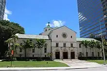 First Presbyterian Church is a historic church in Miami, Florida, USA. It is located at 609 Brickell Avenue in Greater Downtown Miami. Built in 1949, it was placed on the National Register of Historic Places in 1989 (submitted in 1988),[1][2] and designated historic by the City of Miami in 2003. The congregation dates back as far as the city of Miami, 1896,[3] with the original building on another property being funded by Henry Flagler in 1900. The architect of the current building was Lester Geisler.[4] The building represents a late example of the Mediterranean Revival architecture, popular in South Florida earlier in the century. The building sits on a three-acre property surrounded by high-rises. Built for a congregation of over 1,000, church membership dwindled from 1400 to less than 150 by the early aughts.[3]