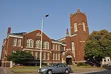 The church building is a rectangular structure, built on a raised basement, that follows a basilica plan.[3] The exterior is composed of red brick, and the early Gothic Revival style exhibits Tudor Revival elements. The building is five bays in length and divided by buttresses capped with white stone weatherings. It is also three bays wide. The shallow, gable roof features a narrow wood cornice. The three-stage central tower on the main facade includes the primary entry on the lower level and a belfry at the top. It is capped with a crenelated parapet. The door at the primary entrance is deeply recessed within a four-centered arch with a tracery-window transom. Pinnacles are located in each corner of the facade.