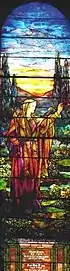 The newest, and final of the Tiffany windows, this window dates from 1925, and was done at the time by the Tiffany studios when they were at their height. The artists at Tiffany didn’t like the way that the flesh colored tones of the stained glass looked in windows so they painted the faces instead of using stained-glass. The window is dedicated to Stuart Brown and his wife, Kay Hay Brown, and given by their children. Mr. Brown was a prominent lawyer in Springfield. His grandfather, Stuart T. Brown, was a mentor of Abraham Lincoln.[7]