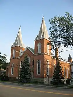 First Presbyterian Church is a historic Presbyterian church located at Waterloo in Seneca County, New York. It was constructed in 1850 and is a monumental brick Romanesque Revival, 104-by-65-foot (32 by 20 m) edifice. The facade features a large rose window and two soaring, square, 90-foot-tall (27 m) corner towers with octagonal spires. A small 1+1⁄2-story chapel was added to the east elevation of the church in 1880–1881.[2]