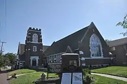 The First United Methodist Church is made up of a 1922 Late Gothic Revival church and an attached, non-contributing, educational wing with an addition. The buildings form an overall U-shaped footprint. The original church is a T-shaped, dark red brick building on a raised basement with a three-story bell tower. It has a steeply pitched gable roof clad with asphalt shingles. The church is divided into two sections: a rectangular gable-roof building that contains the church's sanctuary, and a second gable-roof section forming the head of the T. The bell tower is set in the angle between the two sections, and contains a primary entrance. The exterior has a limestone foundation and limestone water course with Gothic arch openings above containing stained glass windows.[2]