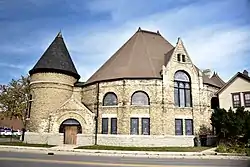 The two-story masonry structure was built to resemble a pocket watch. The building is found on a triangular lot at the southeast corner of the intersection of Villa and Dupage Streets. The building's design is strongly influenced by the Richardsonian Romanesque style. The body of the church has sixteen sides with a tented roof. A tower with a conical roof rises to the same height as the body. This tower is connected to the body with entrances on both sides. The entranceways have gabled roofs and pediments. A similar design is found on the two centrally-located bays of the body on the northeast and southwest. The church features a 4-foot (1.2 m) stone base and water table. Eight bays feature flanking pilasters with a wide arch window. The windows of the building are the original stained glass designs.[2]