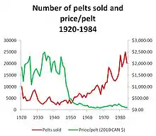 Prices for pelts have varied considerably over the past 100 years. They were highest in the 1920s and 1930s, when average prices were about US$100.[6] In 1936, pelts were being offered for sale in New York City for $450–750 per pelt.[70] Prices declined through the 1960s, but picked up again in the late 1970s. In 1979, the Hudson's Bay Company paid $410 for one female pelt.[70] In 1999, 16,638 pelts were sold in Canada for C$449,307 at an average price of $27.[71]