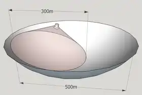 It has a novel design, using an active surface made of 4,500 panels to form a moving parabola of metal panels in real time.[5] The cabin containing the feed antenna, suspended on cables above the dish, can move automatically by using winches to steer the instrument to receive signals from different directions. It observes at wavelengths of 10 cm to 4.3 m.[6][7]