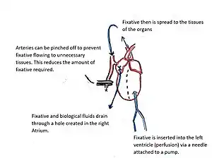 Perfusion: Perfusion is the passage of fluid through the blood vessels or natural channels of an organ or organism. In tissue fixation via perfusion, the fixative is pumped into the circulatory system, usually through a needle inserted into the left ventricle. This can be done via ultrasound guidance, or by opening the chest cavity of the subject.[8] The fixative is injected into the heart with the injection volume matching the typical cardiac output. Using the innate circulatory system, the fixative is distributed throughout the entire body, and the tissue doesn't die until it is fixed. When this method is used, a drainage port must also be added somewhere in the circulatory system to account for the addition of the volume of the fixative and buffer, this is typically done in the right atrium. The fixative is pumped into the circulatory system until it has replaced all of the blood. Using perfusion has the advantage of preserving morphology,[9] but the disadvantages are that the subject dies and the volume of fixative needed for larger organisms is high, potentially raising costs. It is possible to decrease the necessary volume of fluid to perform a perfusion fixation by pinching off arteries that feed tissues not of interest to the research involved. Perfusion fixation is commonly used to image brain, lung, and kidney tissues in rodents, and is also used in performing autopsies in humans.[7][10]