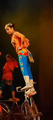 A fixed gear bike is also used in the circus arts (artistic cycling). When the saddle and handlebars are at the same height, an acrobat can stand on the handlebars and saddle and perform acrobatic exercises, sometimes involving multiple people, while continuing to circle the circus ring. It can be found as a niche sport in many countries. In addition to better speed control, the use of a fixed gear bike allows the artist to ride the bike backwards and/or only on the back wheel.