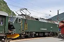 Up until 1998 it was Norges Statsbaner who operated the line, but then Flåm Utvikling took over the role, though NSB still actually operates the trains with the railway line itself is owned by Jernbaneverket. The company operates five El 17 Locomotives, and has two trains with a locomotive at each end of six B3 passenger cars on the 20 km long Flåmsbana. The rolling stock is painted green. The El 17 replaced the aging El 11 in 1998. [2]