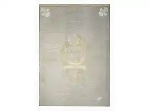 OBVERSE: Azure the Blessed Virgin Mary Argent vested Gules cloaked Azure crowned and enhaloed of mullets, holding the Christ child and standing on a crescent above a scroll Argent inscribed REFUGIUM PECCATORUM [Refuge of Sinners] in letters Sable ensigning the arms of Beauharnois (Argent a fess and in chief three martlets Sable) ensigned by a marquis’s coronet, suspended therefrom the insignia of the Ordre de Saint-Louis and supported by two eagles close, all between four fleurs-de-lis reversed, two in bend and two in bend sinister Argent; REVERSE: Azure the arms of France Modern (Azure three fleurs-de-lis Or) ensigned by the Royal Crown of France and environed by two palm branches Or bound by a ribbon Gules all between four fleurs-de-lis reversed, two in bend and two in bend sinister Argent;[3]