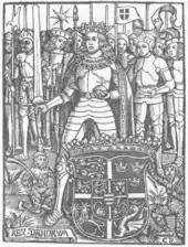 In the Gelre Armorial, dated c. 1340–1370, such a banner is shown alongside the coat of arms of the king of Denmark.[10] This is the earliest known undisputed colour rendering of the Dannebrog. At about the same time, Valdemar IV of Denmark displays a cross in his coat of arms on his Danælog seal (Rettertingsseglet, dated 1356). The image from the Armorial Gelre is nearly identical to an image found in a 15th-century coats of arms book now located in the National Archives of Sweden (Riksarkivet). The seal of Eric of Pomerania (1398) as king of the Kalmar union displays the arms of Denmark chief dexter, three lions. In this version, the lions are holding a Dannebrog banner.
