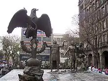Red, white, and green are the colors of the national army in Mexico. The central emblem is the Mexican coat of arms, based on the Aztec symbol for Tenochtitlan (now Mexico City), the center of the Aztec Empire. It recalls the legend of an eagle sitting on a cactus while devouring a serpent that signaled to the Aztecs where to find their city, Tenochtitlan.[1] A ribbon in the national colors is at the bottom of the coat of arms. Throughout history, the flag has changed several times, as the design of the coat of arms and the length-width ratios of the flag has been modified. However, the coat of arms has had the same features throughout: an eagle, holding a serpent in its talon, is perched on top of a prickly pear cactus; the cactus is situated on a rock that rises above a lake.