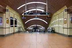 Instead, the station platforms consist of two chambers linked by cross tunnels, each having two platforms on top of each other. The side of each chamber was made up of two drift tunnels, one at the top and one at the bottom. These were then linked together by 228 vertically raise bored shafts, 1 metre in diameter and 3 metres apart. The shafts and drifts were then filled with concrete, and formed the side skeleton of the station chambers. The arch of each chamber was then constructed underground across the top of the two side walls, the material below the arch excavated down to the bottom of the side walls, and temporary cross struts added between the raise bored columns until the permanent elements were added. This innovative method resulted in a $1 million saving in construction costs (in 1975 dollars).[7]