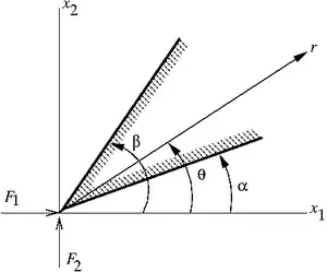 To get around this problem, we consider a bounded region of the wedge and consider equilibrium of the bounded wedge.[2][3] Let the bounded wedge have two traction free surfaces and a third surface in the form of an arc of a circle with radius . Along the arc of the circle, the unit outward normal is where the basis vectors are . The tractions on the arc are